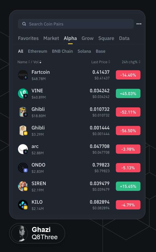 - ستظهر لك قائمة العملات المدرجة في Binance Alpha.